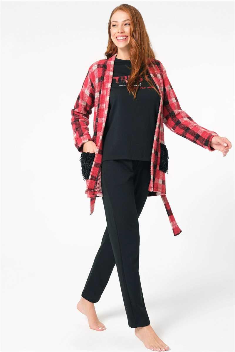 Kadın Ekose Yandan Cepli Sabahlık Göğüs Baskılı Uzun Kollu Sweatshirt ve Pantolon 3'lü Takım (5633) (MAN5633-01)