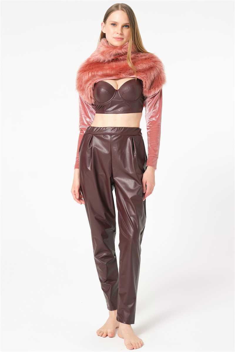 Kadın Polar Kumaş Bolero Deri Görünümlü Balenli Destekli Dolgulu Askıları Çıkabilen Büstiyer Sütyen ve Yandan Cepli Pantolon Pijama 3'lü Takım (9761)