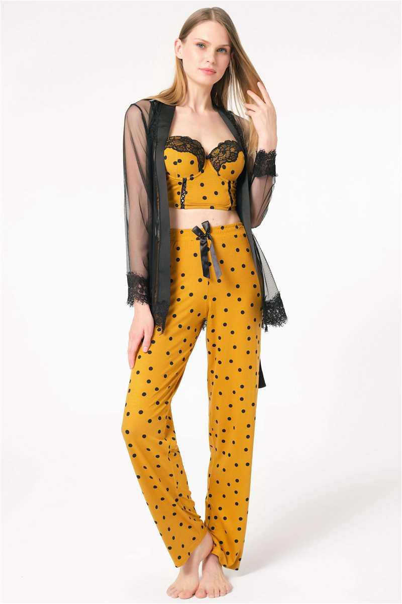 3. Pantolon Pijama: Takımın pantolon pijama parçası, yumuşak kumaşı ve rahat kesimi ile en üst düzeyde konfor sağlar. Esnek bel lastiği sayesinde, pijama rahatça vücuda oturur ve herhangi bir baskı yapmaz. Uzun kesimi, bacakları zarif bir şekilde sarar ve rahat hareket etmenize olanak tanır. Puantiyeli desen, pantolonun şıklığını tamamlar ve takımın genel zarafetiyle uyumlu bir görünüm oluşturur. Pantolonun alt uçlarındaki dantel detayları, pijamanın şıklığını ve feminenliğini bir adım daha öteye taşır.