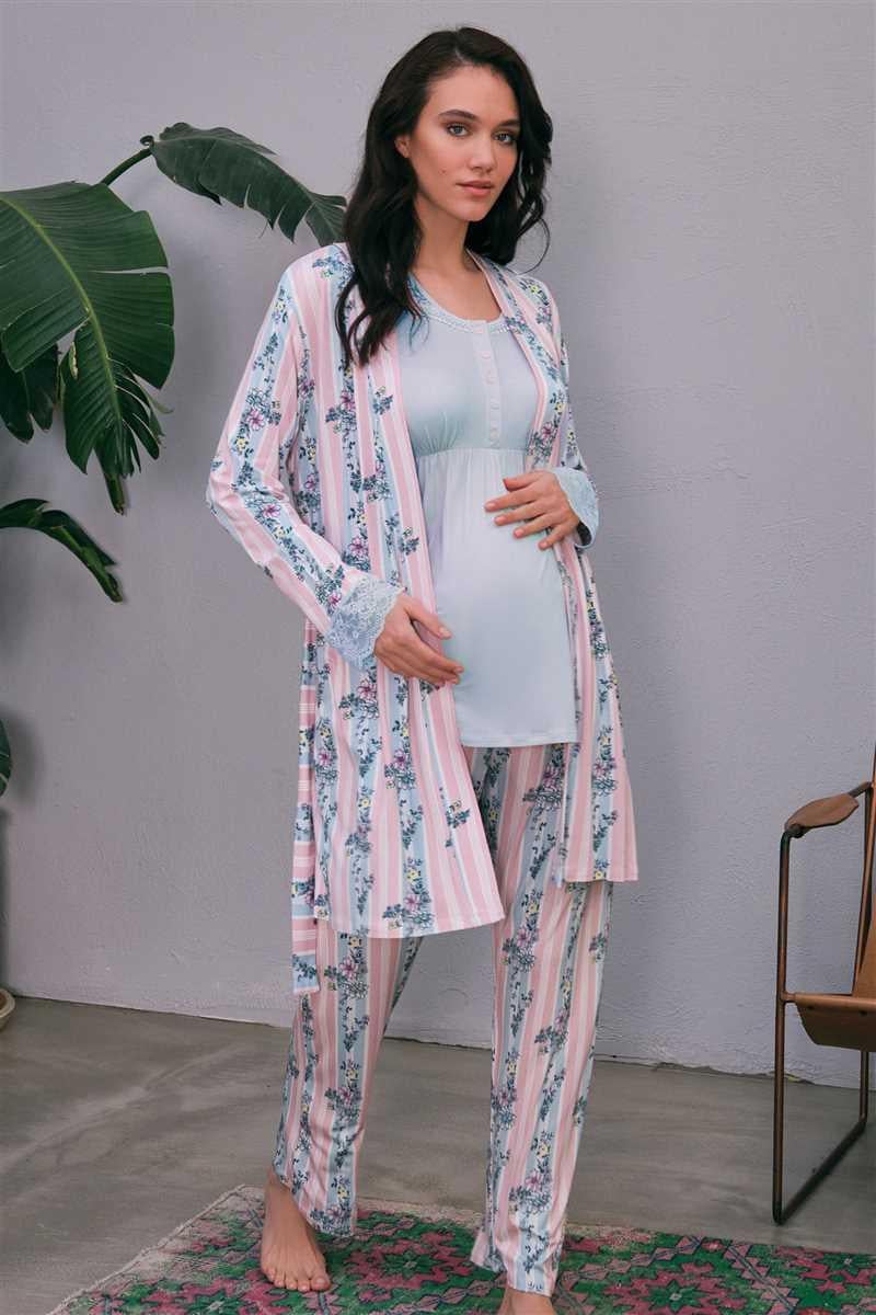 Kısa Ad:Kadın Viskon Hamile Lohusa Dantelli Sabahlık Önden Açılan Emzirme T-Shirt ve Pantolon Pijama 3'lü Takım (5651)