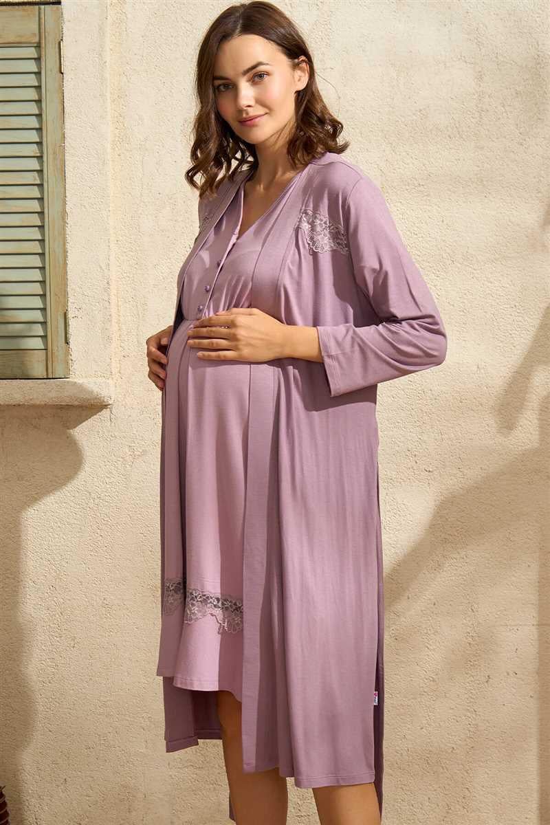 Kısa Yarım Kol V Yaka Kadın Viskon Düz Yazlık Uzun Dantel Detaylı Hamile Gecelik Sabahlık Anıl 5776