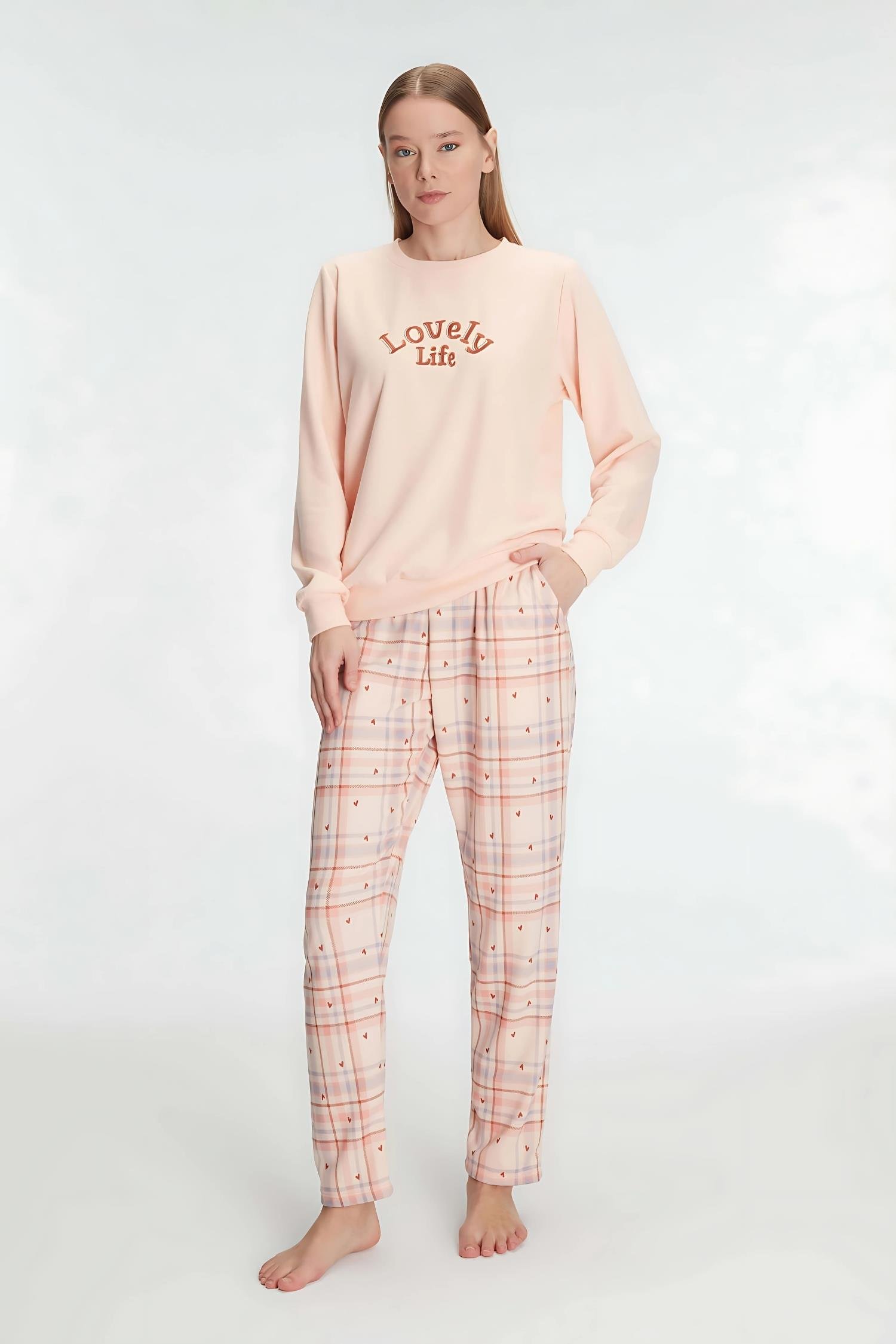 Somon Pamuklu Kışlık Uzun Kol Pijama Takımı, 100 % Pamuk kumaşı ile cildinize uyum sağlar ve gün boyu konforlu bir kullanım sunar. Hem evde hem de dışarıda rahatlıkla kullanabileceğiniz çok yönlü bir tasarıma sahiptir.