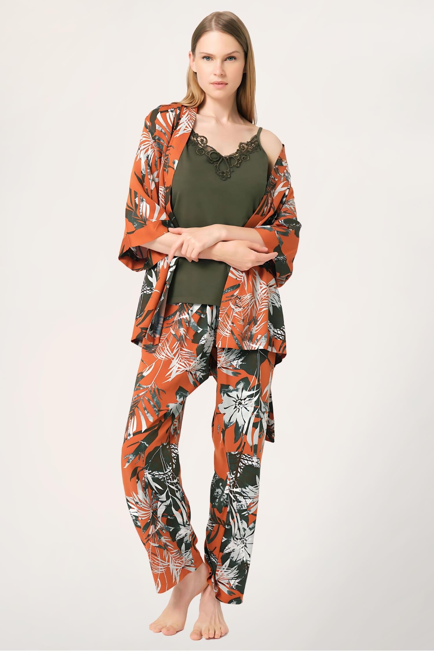 Anıl 5795 İp Askılı V Yaka Viskon Çiçek Desenli Kışlık Örme Normal Bel Nakış Detaylı Pijama Takımı Sabahlık
